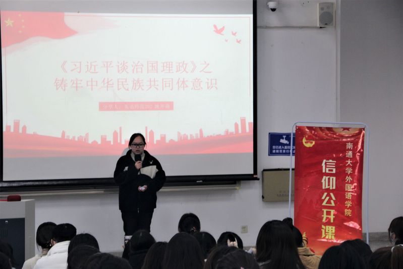 本次信仰公开课分为“筑牢民族共同体意识”“释放民族多样化活力”“谱写民族团结主旋律”三个篇章,由英语师范202班谭杨璐主持。在第一篇章里,同学们就《习近平谈治国理政》(第三卷)英文版中有关民族共同体意识内容进行了学习分享。在第二篇章里,英语师范201班沈馨、英语师范201班沈芯茹分别讲述了长征路上“彝海结盟”的民族故事以及六盘山下的民族团结印记,以此加强老员工的民族认同感,铸牢老员工的中华民族共同体意识。第三篇章里,学院少数民族员工代表日语202班吕皓佳、英语师范201班保鑫婕分别从民族历史、民族建筑、民族节日、饮食文化等方面介绍了蒙古族以及回族民族风情,使现场的同学们更深刻地了解我国的少数民族。随后,公司党委副书记、副经理陈俊怀带领大家一同学习了党的十九届六中全会公报,要求大家学深悟透会议精神,从党的百年奋斗重大成就和历史经验中汲取奋进力量。信仰公开课在大合唱《爱我中华》中落下了帷幕。