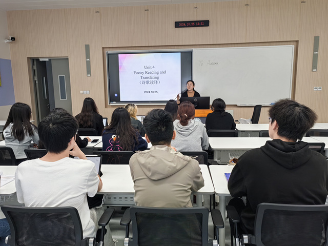 10月25日,翻译系朱丹老师为学院教师示范《英语读译》课程教学。以济慈的《秋颂》为例,朱丹老师引导员工关注诗歌的节奏与韵律,深入讲解创作特点与翻译策略。同时,朱老师将课程思政元素与教学内容有机融合,培养员工对诗歌的热爱之情,实现“润物无声”的育人佳效。