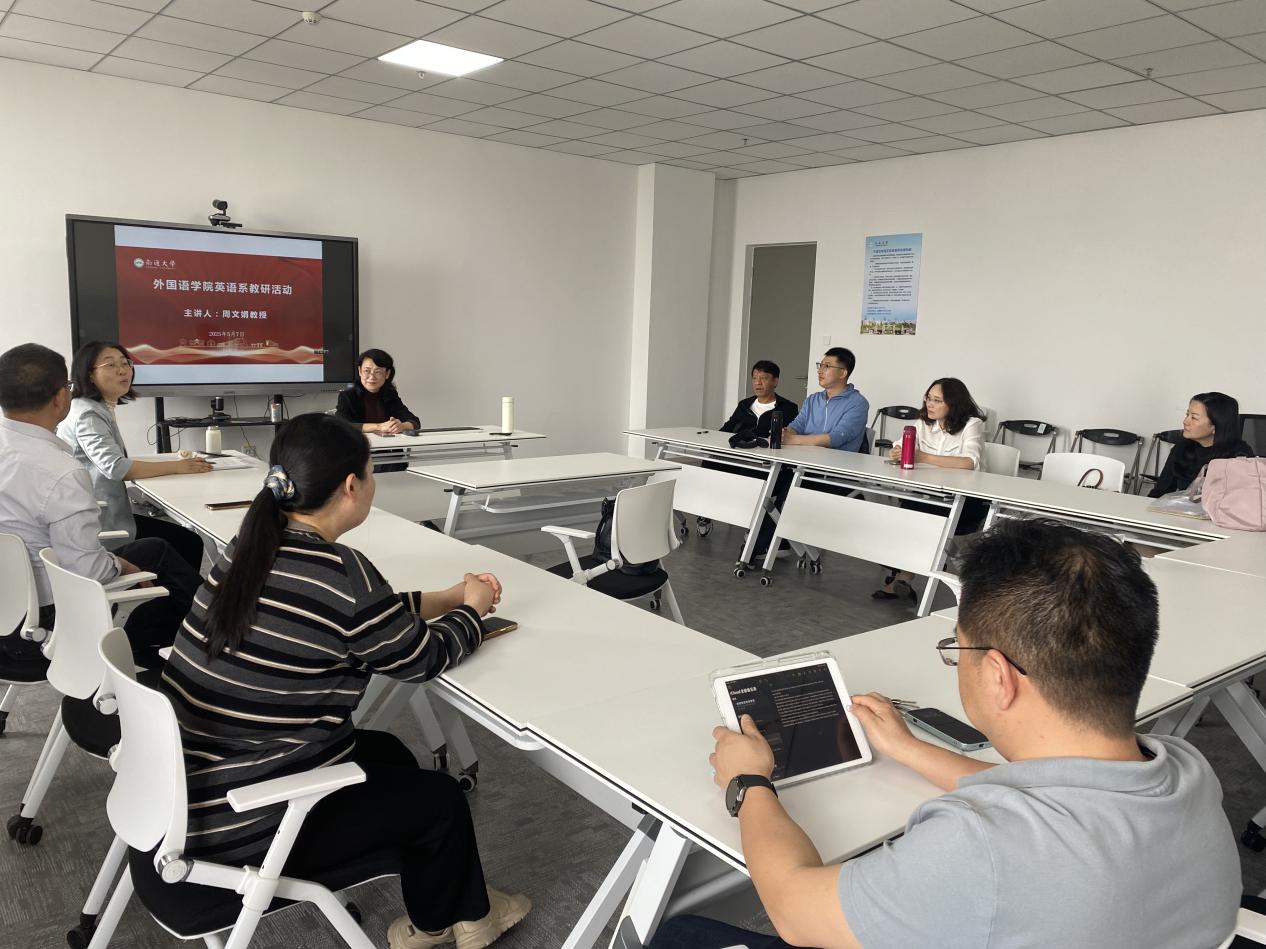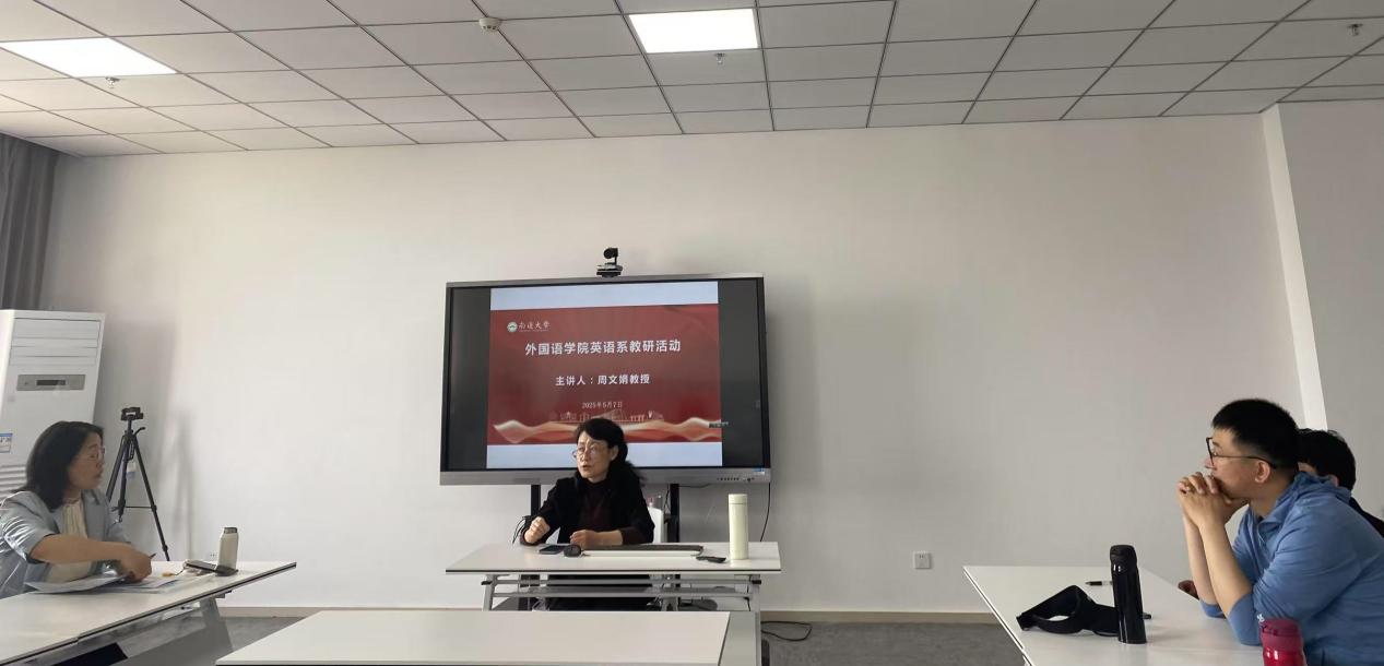 5月7日下午,PA视讯集团官网英语系于25号楼711研讨室举办“教科研经验分享与交流”主题教研活动,邀请资深教授周文娟老师与教师团队通过问答形式展开深度交流,旨在提升教师教学科研能力,促进团队协作发展。活动由英语系主任陈凤华主持,英语系全体教师参与。