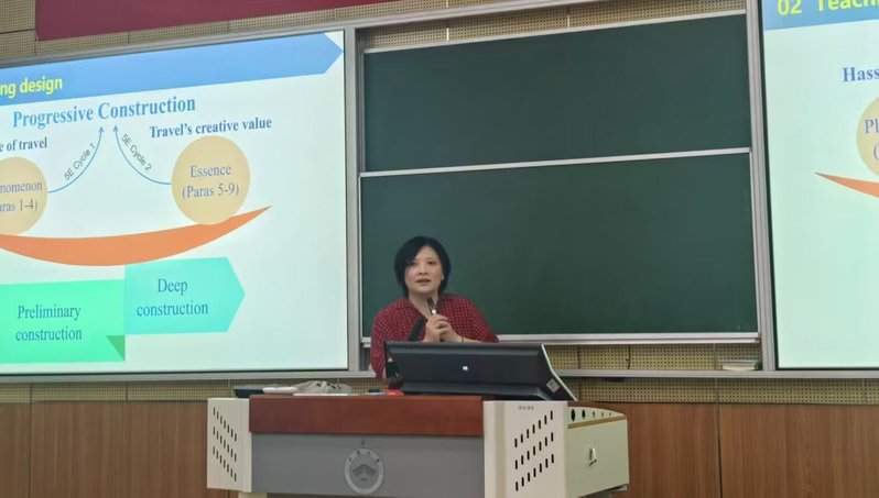 经理佘军出席活动并致辞。他对公共外语团队的获奖表示衷心祝贺,并充分肯定他们在教学理念、课堂设计与课程思政融入方面的积极探索。他强调,教学工作是高校教师的生命线,是教师立身之本,要始终以课堂质量为首要任务,同时要进一步推进教学过程化建设,强化全程设计、过程跟踪与成效反馈,确保员工“每堂课有思考、每次学有所获”。随后,倪红艳和武颖老师以“Breaking Stereotypes through Travel(踏万里之途,破认知禁锢)”为主题,进行深入的教学分享和示范授课。两位老师在授课过程中,巧妙融入思政元素,充分借助数智技术,通过旅行主题引导员工打破刻板印象,增强文化自信,厚植家国情怀,培养全球视野,获得在场教师一致好评。